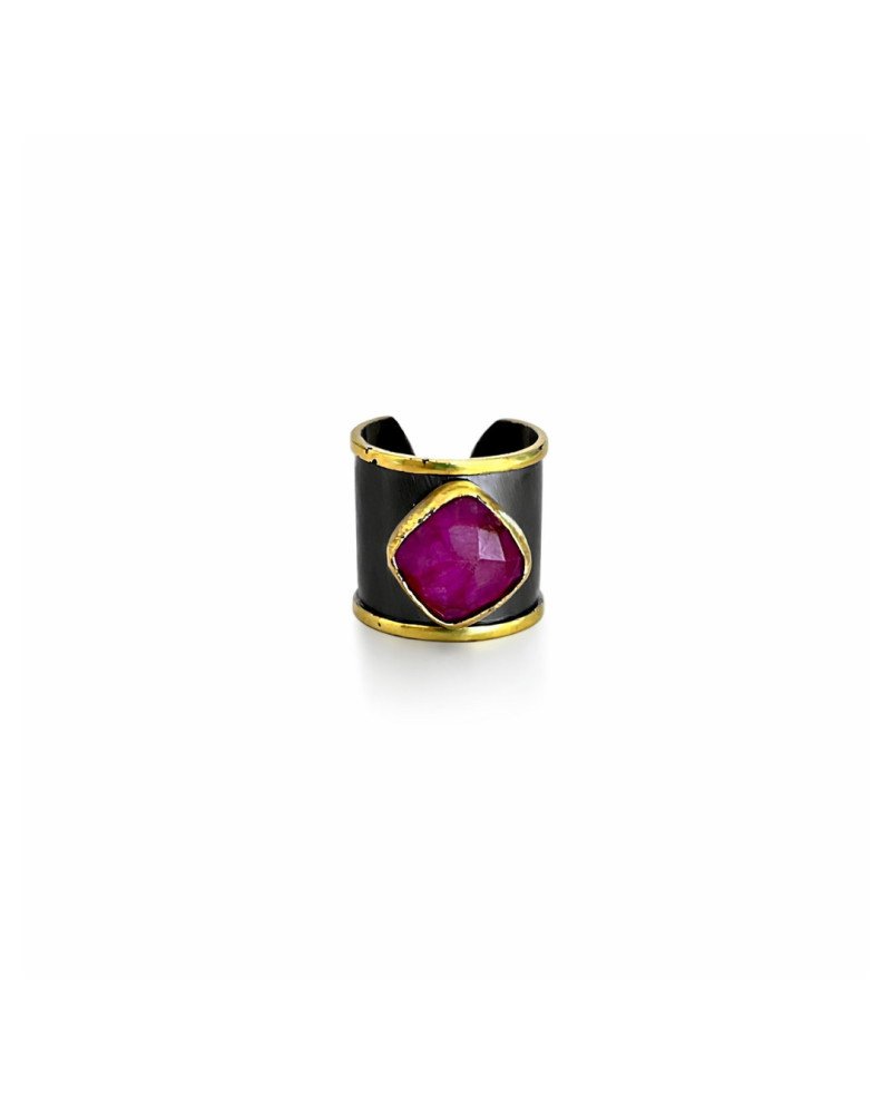 Anillo hecho de latón esmaltado en color grafito. lleva un ónix central de color fucsia..Maravillodo