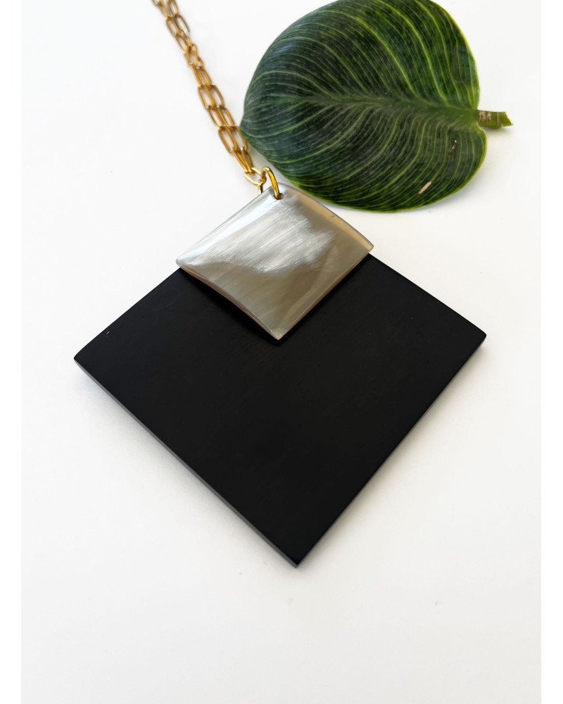 Este collar está hecho con madera de ébano y con cuerno, combina genial con cualquier look, con vestidos o con trajes, para ir a trabajar o para alguna ocasión especial .