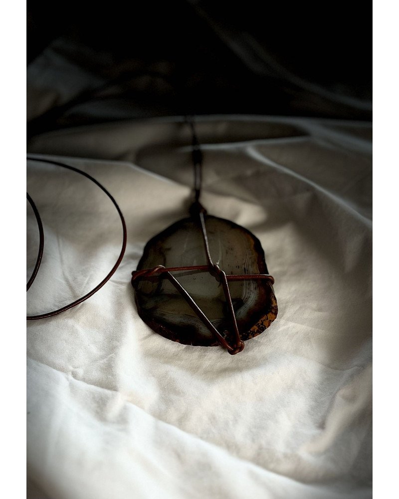 Espectacular collar con una Ágata fabulosa en tonos marrones y beis, cuelgan de un cordón de cuero de primerísima calidad . Es adaptable en largo .