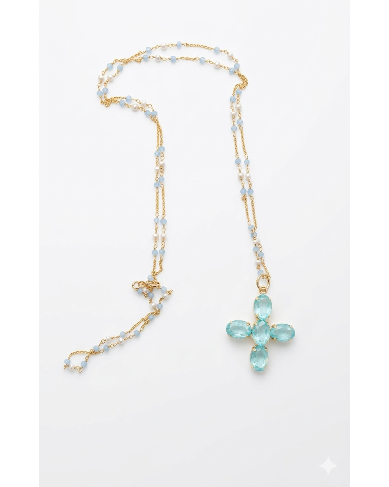 Preciosa cruz con cristales facetados en color verde agua , lleva una cadena larga de Ágatas que la hacen lucir fantástica.