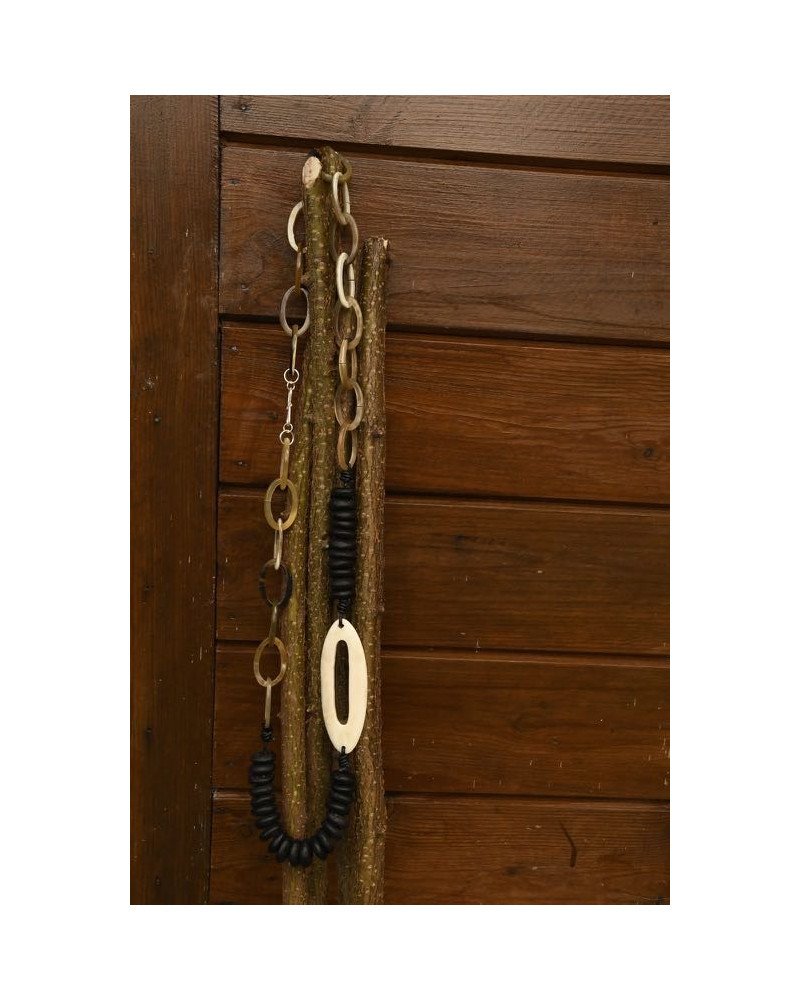 Collar largo hecho con una pieza ovalada de cuerno pulido a mano central , otras más pequeñas de cuerno también y cuentas de madera color negro de Africa .