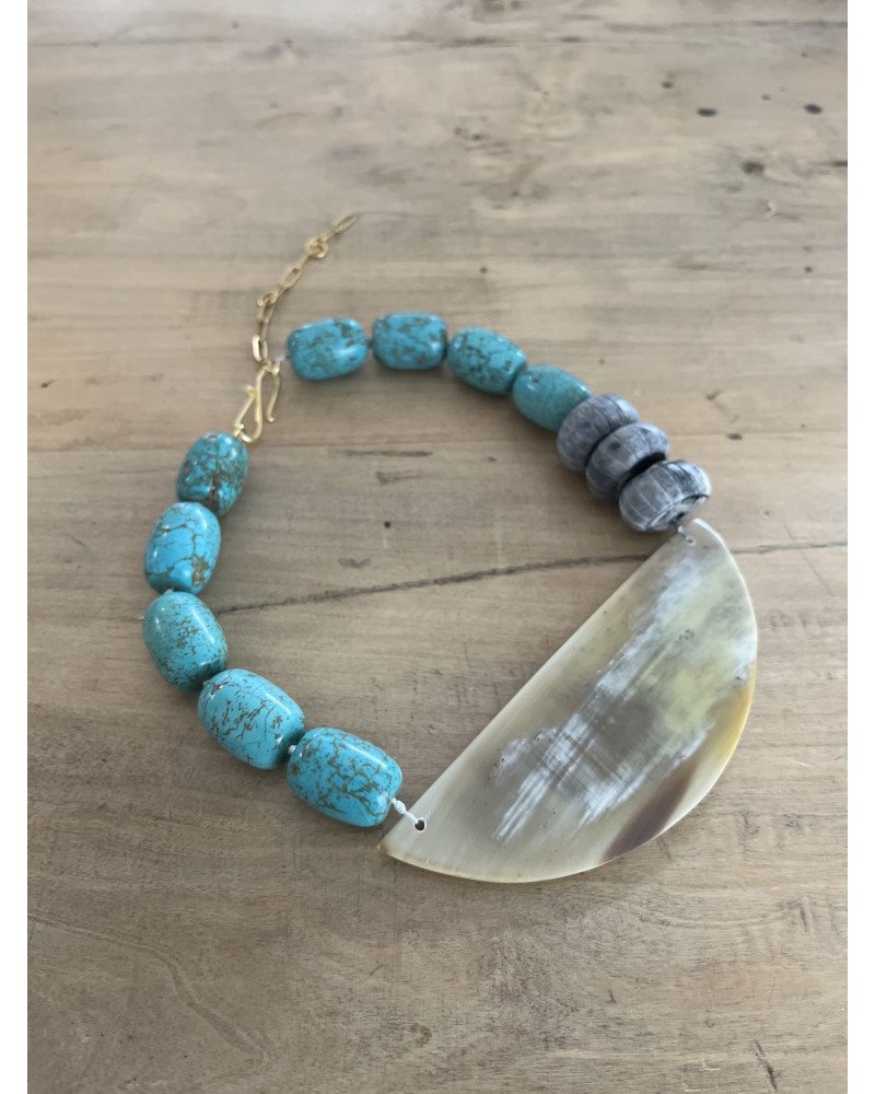 Collar magnífico hecho con turquesas , cuentas de Africa y pieza de cuerno central.