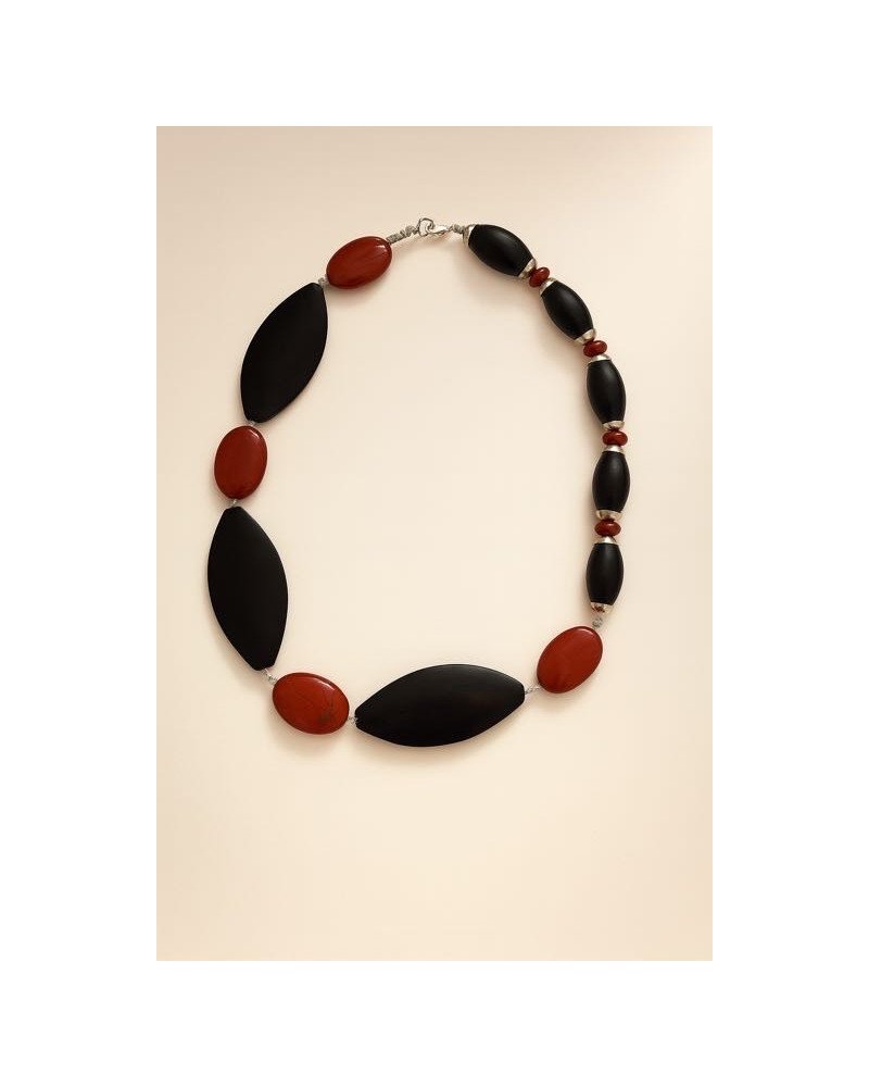 Collar Pasión, combina unos materiales mágicos. Madera de ébano, ónix negro y granate, coral y plata