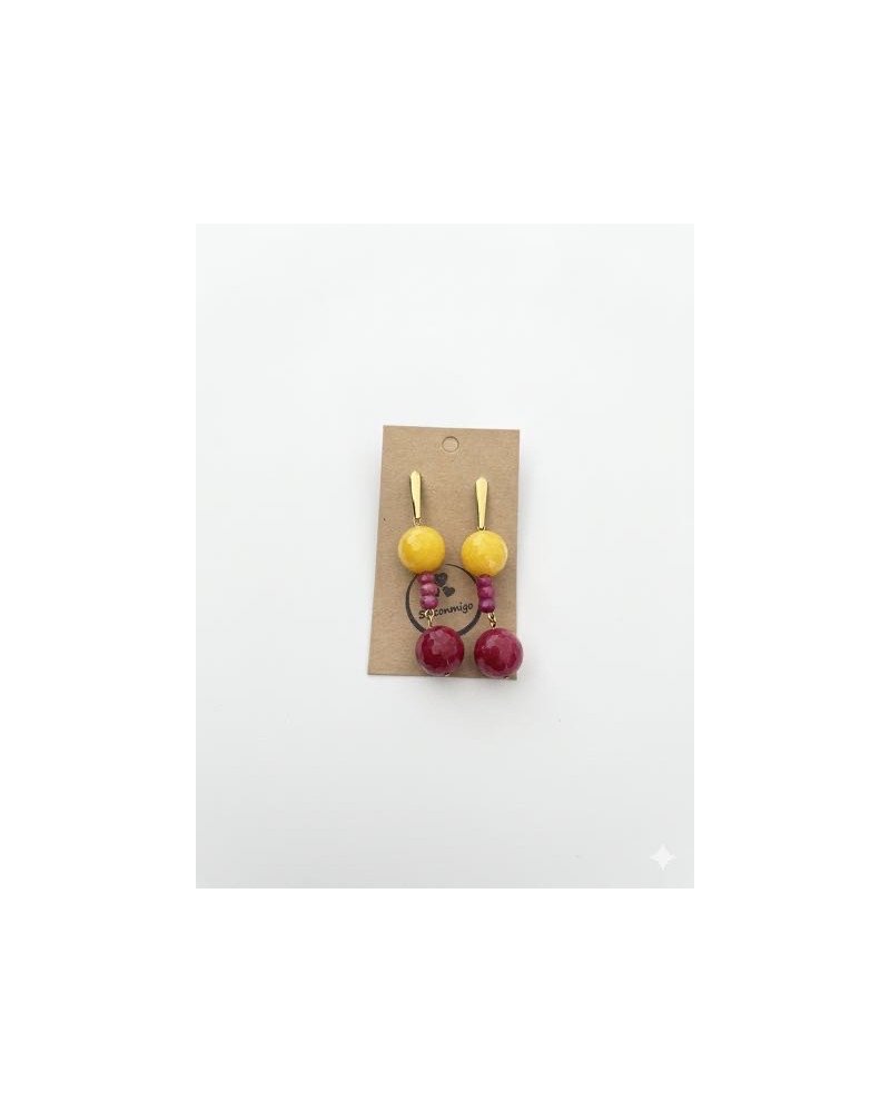 Pendientes hechos con bolas de Jade amarilla y fucsia , Ágatas fucsia y gancho acero inoxidable con baño de oro.