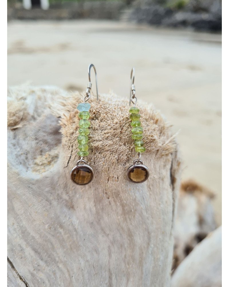 Preciosos pendientes cuarzo humo y ágatas color verde. Elegantes y actuales, colores ideales.