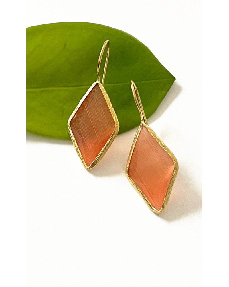 Pendientes con forma de rombo, están hechos en latón y llevan unos preciosos cuarzos naranja cortados en rombo .