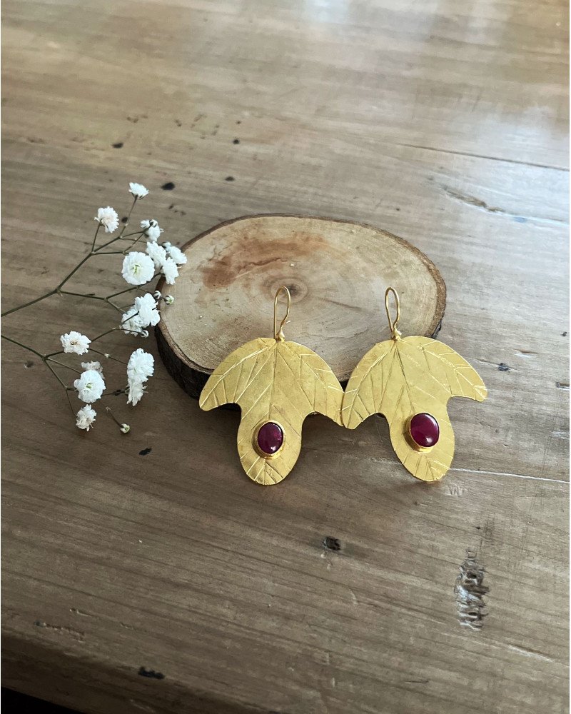 Preciosos pendientes en forma de hoja con un ónix color fucsia . Elegantes y llamativos .